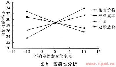 敏感性分析就是預(yù)測(cè)和分析對(duì)項(xiàng)目經(jīng)濟(jì)評(píng)價(jià)起作用的各個(gè)變量因素發(fā)生變化時(shí),對(duì)項(xiàng)目經(jīng)濟(jì)效果的影響程度。圖5分析了二氧化碳在CDM中的銷售價(jià)格、經(jīng)營成本、產(chǎn)量和建設(shè)造價(jià)在-10%~10%范圍內(nèi)變化時(shí)內(nèi)部收益率的變化。從圖5可知,當(dāng)產(chǎn)量變化從0變化至10%時(shí),內(nèi)部收益率從28.37%變化至33.31%,變化幅度最大,其次是建設(shè)造價(jià)。產(chǎn)量(即礦井通風(fēng)氣的抽采量)對(duì)項(xiàng)目的經(jīng)濟(jì)效果影響最明顯,其次是項(xiàng)目的建設(shè)造價(jià)。