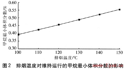 ② 排煙溫度對(duì)維持運(yùn)行的甲烷最小體積分?jǐn)?shù)影響較大,當(dāng)排煙溫度在100~150℃時(shí),維持運(yùn)行的最小體積分?jǐn)?shù)為0.38%~0.56%,且隨排煙溫度的增加以線性關(guān)系遞增。