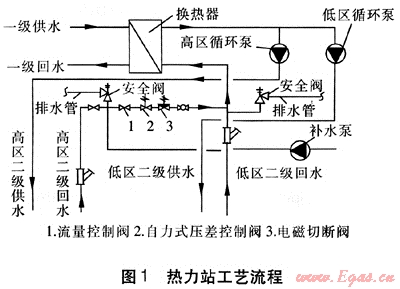 熱力站的工藝流程見圖1。高低兩區(qū)回水管道進入熱力站后,高區(qū)二級回水首先經(jīng)過站內(nèi)除污設備,再經(jīng)過流量控制閥、自力式壓差控制閥等裝置,對高區(qū)二級回水的流量和壓力進行調(diào)整后,與低區(qū)二級回水共同匯入站內(nèi)回水總管進入換熱器換熱,然后由供水管道輸送到各自的循環(huán)泵進行供熱。為避免出現(xiàn)高低區(qū)搶水的現(xiàn)象,在高區(qū)進站回水管道上安裝自力式流量控制閥,通過自力式流量控制閥對高區(qū)供熱系統(tǒng)的流量進行控制,保證了高區(qū)循環(huán)泵不對低區(qū)產(chǎn)生搶水現(xiàn)象[1]。在高區(qū)二級回水管道上安裝常開式電磁切斷閥,以備供熱期間熱力站突然停電時能夠迅速隔斷高低區(qū)供熱系統(tǒng)。這樣,在自力式壓差控制閥、流量控制閥、電磁切斷閥等設備的共同協(xié)作下,形成了高層建筑高區(qū)與與低區(qū)供熱系統(tǒng)直接連接的供熱形式。
