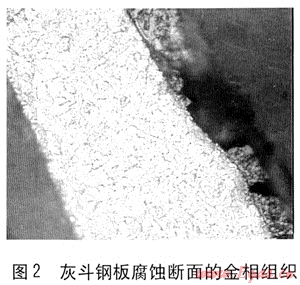 通過對鍋爐灰斗鋼板腐蝕斷面的金相組織分析(見圖2),腐蝕發(fā)生的機(jī)理主要是腐蝕介質(zhì)對鋼板的點(diǎn)蝕和沖蝕,由于點(diǎn)蝕和沖蝕的共同作用,使金屬表面的保護(hù)層剝離,腐蝕介質(zhì)與金屬直接接觸而發(fā)生腐蝕,含有顆粒等雜質(zhì)的高溫、高速煙氣連續(xù)不斷地直接沖擊金屬表面又進(jìn)一步造成鍋爐灰斗金屬表面的沖蝕,因此鍋爐灰斗在非常短的運(yùn)行時(shí)間內(nèi)就出現(xiàn)了穿孔失效的情況[4]。
