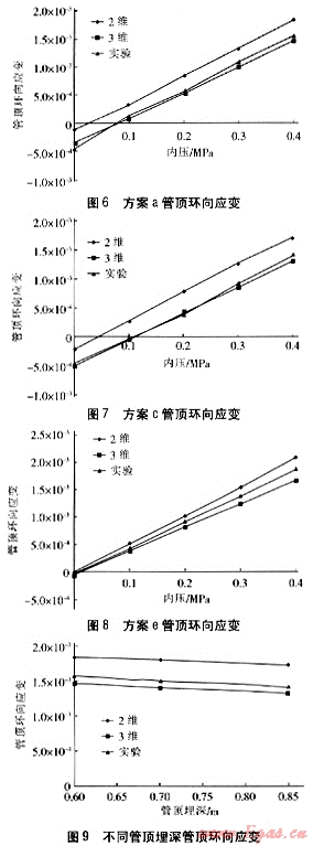 可以看出,管頂環(huán)向應(yīng)變的實(shí)驗(yàn)結(jié)果與3維模型的計(jì)算結(jié)果非常吻合。圖9為不同管頂埋深、內(nèi)壓恒為0.4MPa下,實(shí)驗(yàn)和計(jì)算結(jié)果的對(duì)比??梢钥闯觯煌茼斅裆罟艿乐芟蚋鼽c(diǎn)環(huán)向應(yīng)變的實(shí)驗(yàn)結(jié)果與3維模型計(jì)算結(jié)果很吻合。