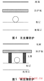 管道兩端用盲板堵上。在被測(cè)管道中部環(huán)向方向布置電阻應(yīng)變片,管頂位置布置1個(gè)電阻應(yīng)變片,然后向兩側(cè)環(huán)向分別以30°為間隔均勻布點(diǎn)。管頂沿軸向均勻布點(diǎn),測(cè)點(diǎn)間距為0.2m。共布有測(cè)點(diǎn)26個(gè)。防護(hù)結(jié)構(gòu)選擇兩種,無(wú)支撐防護(hù)見(jiàn)圖4,有支撐防護(hù)見(jiàn)圖5。選取5個(gè)測(cè)試方案,見(jiàn)表1。