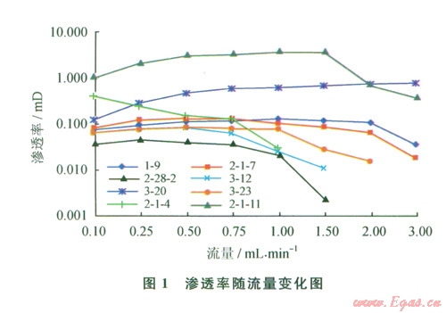 速敏性評(píng)價(jià)實(shí)驗(yàn)的目的在于了解儲(chǔ)層滲透率的變化與儲(chǔ)層中流體流動(dòng)速度的關(guān)系,評(píng)價(jià)敏感程度及臨界流速,為油氣井合理產(chǎn)量和注入速度提供依據(jù)。對(duì)8塊巖樣的實(shí)驗(yàn)分析表明:珍珠沖組儲(chǔ)層滲透率與流量的關(guān)系多樣化,有6塊巖樣滲透率在低流速段隨流速增大而增大,當(dāng)流速增大到一定程度時(shí),滲透率急劇下降,產(chǎn)生速敏性;1塊巖樣在最小流量下就產(chǎn)生了速敏效應(yīng);l塊巖樣隨著流量的增大,滲透率持續(xù)增高(1)。巖樣滲透率損害率為67.2%~94.1%,屬于強(qiáng)速敏的占75%;臨界流量主要在0.52.0 mLmin之間,折算的臨界流速為1.796.91 md。臨界流速和滲透率損害率受巖樣本身滲透率影響明顯,一般滲透率越低,臨界流速低,滲透率損害率越大。
