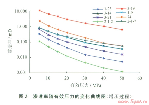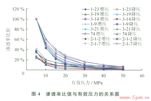 隨有效壓力的增大,巖樣滲透率急劇下降,下降幅度很大(3),尤其是在低壓力區(qū)間。以第一個(gè)壓力點(diǎn)(5 MPa)的滲透率為初始滲透率,計(jì)算不同有效壓力下滲透率與初始滲透率的比值——滲透率比,對(duì)全部實(shí)驗(yàn)數(shù)據(jù)進(jìn)行分析可以看出,當(dāng)有效壓力由5 MPa增大到20 MPa時(shí),滲透率下降為初始值的ll.0%~29.4%,平均為20.2%,即滲透率下降了約45;當(dāng)有效壓力增大到50 MPa時(shí),滲透率下降為初始值的1.10%~7.04%,平均為3.73%,即剩余滲透率都低于10%,表明滲透率的下降幅度非常大,應(yīng)力敏感性強(qiáng)。