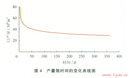 從圖4中可以看出在壓裂水平井中初始產(chǎn)量一般相對較高且隨時間遞減較快,在生產(chǎn)4050 d后遞減速率才趨于平穩(wěn)。通過計算預(yù)測年均日產(chǎn)量為34.460 9×104 m3,實際生產(chǎn)時的年均日產(chǎn)量為33.564 9×104 m3,實際產(chǎn)量和預(yù)測產(chǎn)量的誤差為2.6%。從上面數(shù)據(jù)可以看出實際產(chǎn)量和模擬產(chǎn)量存在一定差別,這主要是模擬計算受到提供的裂縫間距、裂縫方位角和表皮系數(shù)等參數(shù)的影響。另外,實際生產(chǎn)時,還會存在兩種微弱的壓力降:氣體在水平井筒內(nèi)流動的摩阻壓降[9]及從裂縫進(jìn)入水平井筒時產(chǎn)生的加速度壓降,它們對于模擬計算結(jié)果也會產(chǎn)生一定的影響。