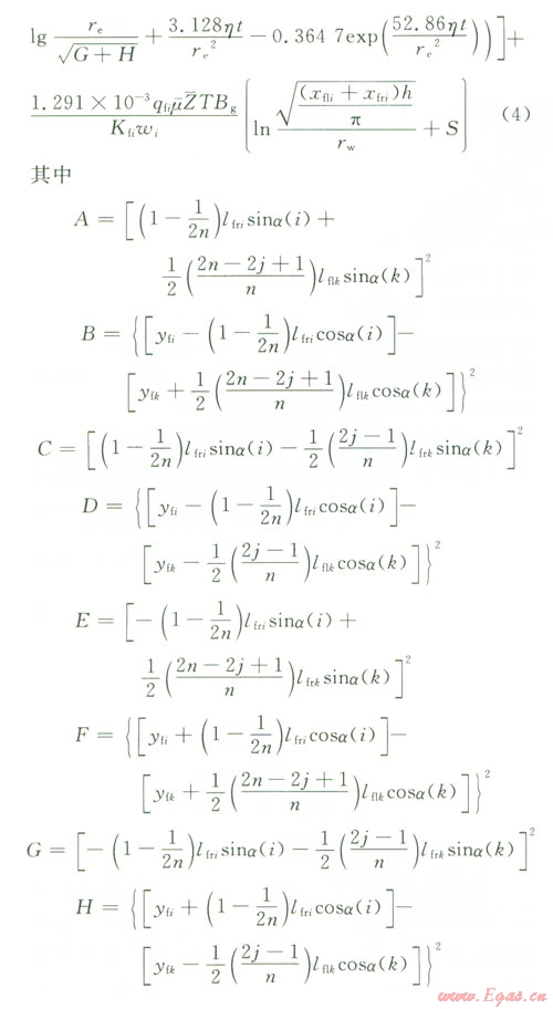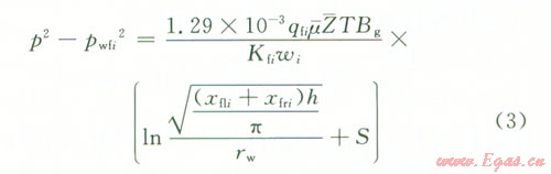 根據(jù)面積相等可得(xfli+ xfri)h=nRi2(式中xflixfri分別為第i條裂縫的左右翼的長度,Ri為氣藏的當(dāng)量半徑),所以第i條裂縫的流動可以看成是流動半徑為Ri,其中,地層厚度為ωi,邊界壓力的平方為裂縫尖端壓力平方p2(xfiyfi,t),井底流壓為水平井井筒內(nèi)壓力pwfi的微型氣藏[7],其流動方式可以看成是氣藏的平面徑向流。根據(jù)氣井產(chǎn)能計算公式,可以把氣體由裂縫向井筒的滲流過程表示為: