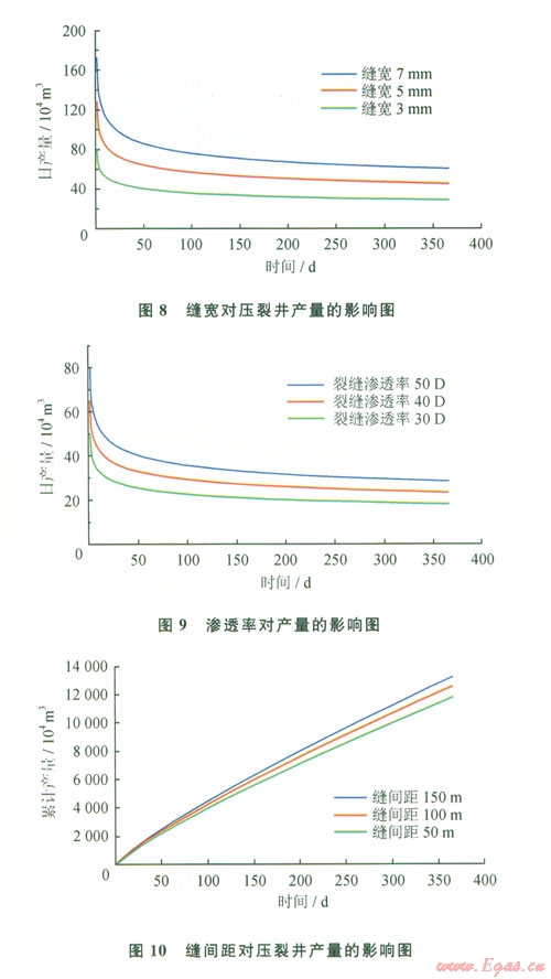 綜合圖810可以得知:壓裂水平氣井的產(chǎn)量是隨著裂縫寬度和裂縫滲透率的增加而增加,并且增長效果顯著。但是隨著滲透率和寬度的逐漸加大,產(chǎn)量增加的幅度在減小;裂縫間距的增加也會引起產(chǎn)量的增加。因此,在壓裂方案設(shè)計和實際施工時應(yīng)把握好主要因素,使各參數(shù)的數(shù)值控制在合理的范圍內(nèi),最大限度地提高氣井產(chǎn)量。