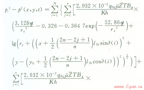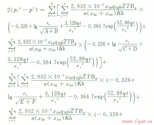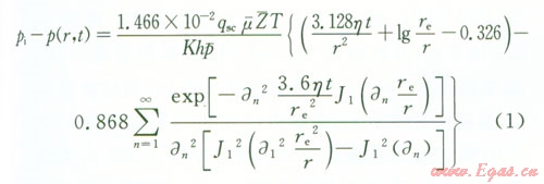 pi為原始地層壓力,MPa;p(x,y,t)為平面上的點(x,y)t時刻地層的壓力,MPa;p(-)為氣藏平均壓力,MPa;qsc為標(biāo)準(zhǔn)狀況下點匯處氣體的體積流量,l04 m3d;μ(-)為平均壓力和溫度下的氣體的黏度,mPa·s;Bg為地下氣體的體積系數(shù),無量綱;K為氣層滲透率,D;h為產(chǎn)層厚度,m;x0y0分別為點匯的坐標(biāo),m;T為氣層溫度,K;re為封閉外邊界半徑,m;t為滲流時間,hZ(-)為平均溫度和壓力下的天然氣偏差因子,利用D-A-K方法求;η為地層導(dǎo)壓系數(shù),μm2·MPa(mPa·s),η=K/(μCφ);an為方程X的根;J1、Y1為第一類、第二類一階貝塞爾函數(shù)。