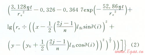 設(shè)第i條裂縫起裂點的坐標(biāo)為(0yfi),左翼裂縫長度為xfli,右翼裂縫長度為xfri,則據(jù)此可求出第i條裂縫左翼和右翼上第j個點匯的坐標(biāo)(取該小段中點坐標(biāo))。然后把各條裂縫上各個點匯的坐標(biāo)代入式(1),在考慮體積系數(shù)的情況下把它化為直角坐標(biāo)系,并利用貝塞爾函數(shù)的性質(zhì)可得第i條裂縫t時刻在地層中任意一點(x,y)處產(chǎn)生的壓降,最后根據(jù)勢的疊加原理就可求出n條裂縫t時刻在地層任意一點(x,y)處產(chǎn)生的壓降,即
