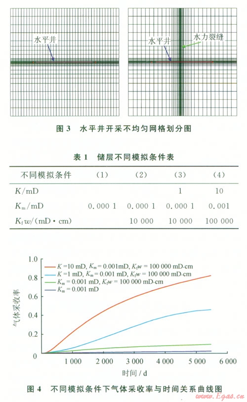 如圖3所示,對(duì)400 m×400 m×20 m的頁(yè)巖氣儲(chǔ)層建立了不均勻網(wǎng)格水平井模型[12],分別模擬了4種生產(chǎn)情況(1),得到了開(kāi)采l5 a的頁(yè)巖氣采收率(4)。