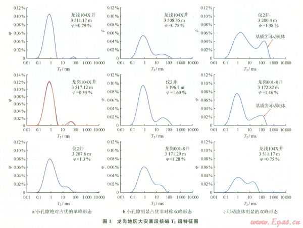 根據(jù)對(duì)中國(guó)石油西南油氣田公司川中油氣礦測(cè)試的秋林1井大安寨段石灰?guī)r壓汞資料的分析,石灰?guī)r基本不具備儲(chǔ)集空間;中國(guó)石油西南油氣田公司勘探開發(fā)研究院所作的龍崗地區(qū)大安寨段灰?guī)r的核磁T2譜特征分析結(jié)果,同樣表明其孔隙度極小,而儀2井大安寨段石灰?guī)r孔隙度高,含基質(zhì)可動(dòng)流體,但卻沒(méi)有工業(yè)氣流產(chǎn)出(圖1)。