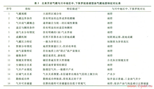 根據(jù)陳更生等[3]總結(jié)的北美頁(yè)巖氣藏l6種地質(zhì)特征與川中地區(qū)中、下侏羅統(tǒng)進(jìn)行對(duì)比的結(jié)果如表3所示。表3表明川中地區(qū)中、下侏羅統(tǒng)油氣藏,絕大多數(shù)條件具有與頁(yè)巖油氣藏類似的特征。如第9項(xiàng):油氣富集特征,目前所獲常規(guī)油氣井,正是在“甜點(diǎn)”油氣富集區(qū)處,應(yīng)用常規(guī)(目前逐漸使用一些非常規(guī)的增產(chǎn)措施,如水平井,而酸化壓裂則早已引人使用)鉆井即能獲得工業(yè)油氣流,可以期待,隨著頁(yè)巖油氣藏開采技術(shù)的引進(jìn)應(yīng)用,必將獲得更大的油氣產(chǎn)量;而成藏機(jī)制和資源量則需要重新進(jìn)行研究和評(píng)價(jià)。