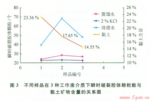 2顯示了頁巖的水化分散速度(m)與黏土礦物含量的關(guān)系。2KCl及蒸餾水在高黏土礦物含量下,具有較好的抑制性能,而在低黏土礦物含量下,其抑制性能對黏土礦物含量的變化不敏感;而滑溜水的抑制性能相對較差,但其抑制性能與黏土含量相關(guān)。圖3顯示了瞬時(shí)形成膠體顆粒數(shù)目(b)值與黏土礦物含量的關(guān)系。3種液體都顯示出在高黏土礦物含量情況下,抑制性能較好。