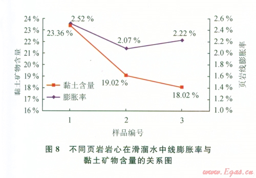 通過對實(shí)驗(yàn)結(jié)果的綜合分析,認(rèn)為頁巖的膨脹性與黏土礦物含量存在一定的相關(guān)性,當(dāng)黏土礦物含量變化較大時(shí),頁巖的膨脹率與黏土礦物含量關(guān)系更為密切。