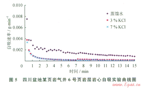 從圖45中可以看出:總的吸液量極少,均表現(xiàn)為初期的吸液量最大,在前3 min吸液速率相對較大,而3 min后自吸曲線趨于平直,吸液量基本趨于零。②對于5號頁巖層,3KCl的自吸量最大,7KCl及未加任何添加劑的蒸餾水巖心自吸量最??;對于6號頁巖層,未加任何添加劑的蒸餾水自吸量最大,3KCl7KCl的自吸量最小。不同層段的頁巖吸液量具有明顯的差異,與黏土礦物含量相關(guān),黏土礦物含量較高的5號巖心吸液量高于含量較低的6號巖心。