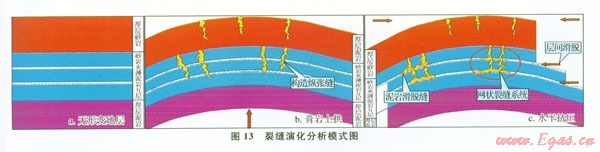 通過裂縫演化分析認(rèn)識(shí)到(圖13):受膏鹽巖“上拱”影響,西區(qū)構(gòu)造變形處砂巖常發(fā)育高角度構(gòu)造縱張縫。受龍門山南動(dòng)向應(yīng)力擠壓,是砂巖間的薄層泥巖發(fā)生層間錯(cuò)動(dòng),從而形成近水平層間滑脫縫。構(gòu)造縫+層間縫=網(wǎng)狀裂縫是儲(chǔ)層重點(diǎn)目標(biāo)。