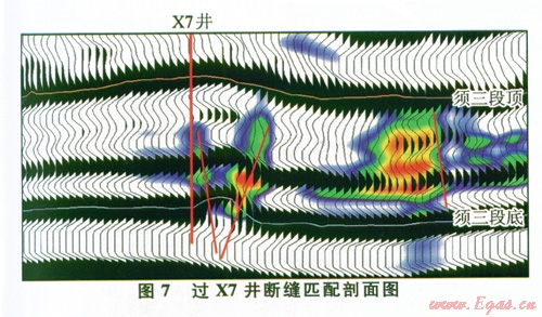 通過合成地震記錄標(biāo)定,確定X7井須三段鈣屑砂巖儲(chǔ)層為強(qiáng)振幅地震反射特征,砂體頂?shù)追謩e對(duì)應(yīng)強(qiáng)波峰或者強(qiáng)波谷;地震剖面上測(cè)試段砂體表現(xiàn)為“透鏡狀”反射特征,表明砂體為分流主河道砂體;X7井測(cè)試段東部