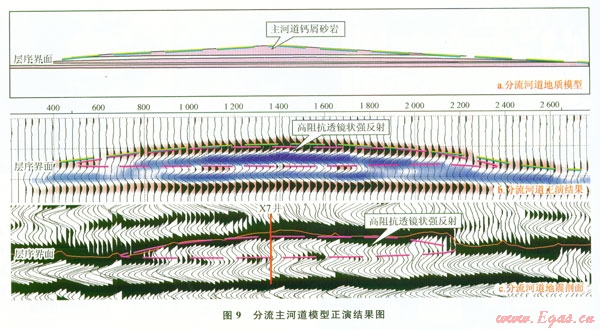 圖9是分流主河道地質(zhì)模型正演結(jié)果與實(shí)際地震剖面對(duì)比圖。圖9中顯示分流主河道因該具有“高阻抗、透鏡狀、強(qiáng)反射”地震響應(yīng)特征,與實(shí)際過井地震剖面特征一致。因此可以利用“高阻抗、強(qiáng)振幅、透鏡反射”預(yù)測(cè)分流主河道鈣屑砂巖分布。