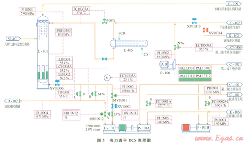 液力透平位于脫硫單元一級主吸收塔C-101的下游,富胺液自一級吸收塔底出來后進(jìn)人液力透平膨脹做功,所產(chǎn)生的動能用以驅(qū)動貧胺液泵,做功后的低壓富胺液送至閃蒸罐。液力透平的DCS流程如圖3所示。