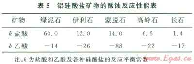 有學(xué)者研究了鹽酸與各種鋁硅酸鹽礦物的反應(yīng)動(dòng)力學(xué),并將反應(yīng)速度常數(shù)的對(duì)數(shù)值為50時(shí)對(duì)應(yīng)的溫度(T50)作為各種鋁硅酸鹽在鹽酸中保持穩(wěn)定的溫度上限,各種鋁硅酸鹽的T50值如表5所示。表5同時(shí)也給出了根據(jù)熱力學(xué)數(shù)據(jù)計(jì)算出來(lái)的鹽酸與醋酸與各種鋁硅酸鹽礦物反應(yīng)的平衡常數(shù)??梢钥闯觯跓崃W(xué)上,這些鋁硅酸鹽均可以溶于鹽酸,但幾乎完全不溶于醋酸;而在動(dòng)力學(xué)上,沸石在鹽酸中最不穩(wěn)定,綠泥石次之,長(zhǎng)石最穩(wěn)定。在儲(chǔ)層中占優(yōu)勢(shì)的鋁硅酸鹽礦物的T50低于儲(chǔ)層溫度時(shí),應(yīng)該考慮在酸化液中用乙酸代替鹽酸[6-8]。