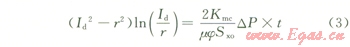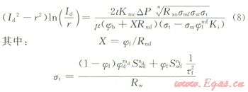 不難看出式(6)已經(jīng)消除了可變膠結(jié)指數(shù)的影響,進(jìn)一步證明了“當(dāng)其他條件不變時(shí),鉆井液濾液侵入地層的深度主要受泥餅滲透率和地層的孔滲特性兩方面因素的控制,這點(diǎn)與非裂縫性砂泥巖地層比較類似”的觀點(diǎn)是經(jīng)得起推敲的。再將式(6)帶入式(3)可以得到: