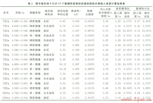 表4是在考慮儲(chǔ)層流體性質(zhì)時(shí)兩種計(jì)算模型在不同裂縫系統(tǒng)中的計(jì)算對(duì)比分析表。同一類型裂縫型地層,從水層→含油水層→含水油層→油層,不管是體積模型還是統(tǒng)計(jì)模型,其計(jì)算結(jié)果均表現(xiàn)出侵入深度是增加的,呈現(xiàn)污染或者損害增加的趨勢(shì)。在結(jié)合所選擇分析井段使用的鉆井液看,都使用的是水基(鹽水)鉆井液,不難分析出,該區(qū)9口井17個(gè)裂縫性致密砂巖儲(chǔ)層段巖石均為親水巖石,若選擇油基鉆井液,鉆井液的侵入深度會(huì)大幅度降低,儲(chǔ)層受污染或損害的幾率也會(huì)降低。