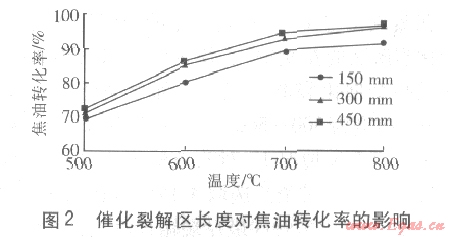 在催化裂解區(qū)溫度為500800、SC等于2.0、氮氣流量為l.0 Ls條件下,對催化裂解區(qū)長度分別為150、300、450 mm時的焦油轉(zhuǎn)化率隨溫度變化的情況進行研究,結(jié)果見圖2。