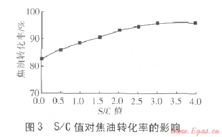 在一定范圍內(nèi),焦油轉(zhuǎn)化率隨SC值的增大而提高。當(dāng)SC值達到一定值后,隨著SC值的增大,焦油轉(zhuǎn)化率變化較小,說明焦油內(nèi)的部分穩(wěn)定成分通過單純增加蒸汽量已不能裂解。