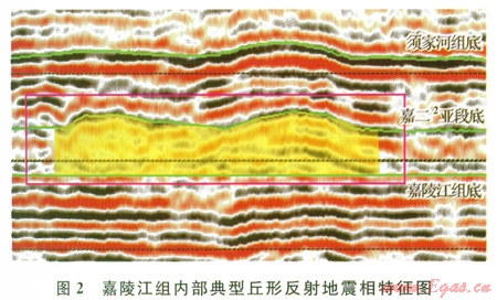 地震剖面上表現(xiàn)為丘形反射,內(nèi)部常見弱的前積反射,內(nèi)部反射時(shí)差較兩側(cè)明顯增大,該類地震相通常代表一種相對(duì)高能的沉積環(huán)境。主要發(fā)育在嘉一段—嘉二l亞段內(nèi),其頂界即嘉二2亞段底界多表現(xiàn)為連續(xù)的強(qiáng)振幅反射(圖2)。