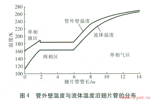 本文對LNG空溫式氣化器單根翅片管的換熱進行了模擬計算,計算時沿管長方向將翅片管分為單相液、兩相與單相氣3區(qū),得出了管外壁溫度、LNG(或氣態(tài)天然氣)溫度以及管內流體表面?zhèn)鳠嵯禂笛毓荛L的分布。翅片管的換熱計算是進行氣化器設計的關鍵,通過進行換熱過程的模擬計算,可以確定設備是否能達到預定的氣化能力,并且可以分析LNG的組成變化或環(huán)境條件改變對換熱器氣化效果的影響。本文的計算結果可以為LNG空溫式氣化器的設計與優(yōu)化提供依據。