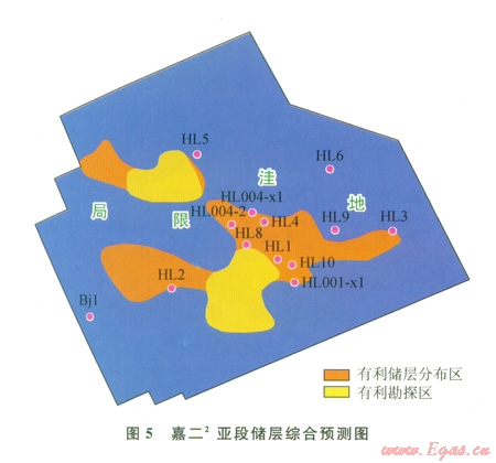 融合多種信息對(duì)嘉二2亞段儲(chǔ)層進(jìn)行綜合預(yù)測(圖5),嘉二2亞段局限臺(tái)洼環(huán)境下灘相儲(chǔ)層主要分布在較高部位及其斜坡帶,有利儲(chǔ)層地震反射特征表現(xiàn)為強(qiáng)振幅區(qū)域中相對(duì)較弱振幅的暗點(diǎn)反射。儲(chǔ)層平面分布呈現(xiàn)較強(qiáng)的非均質(zhì)特征,HL2井西北及東南斜坡區(qū)、HL8井高部位、南部及東部斜坡、HL5井西部為有利儲(chǔ)層發(fā)育區(qū),其中HL2井東南高部位及其斜坡、HL5井西高點(diǎn)為研究區(qū)下一步最有利勘探區(qū),HL2井西北斜坡、HL5井南斜坡和HL001-Xl井東部地區(qū)為較有利勘探區(qū)。