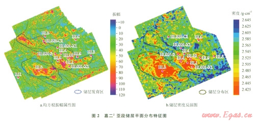 根據(jù)儲(chǔ)層地震、測井響應(yīng)特征,對(duì)嘉二段非均質(zhì)儲(chǔ)層采用地震反射特征分析、屬性分析和地震反演,精細(xì)刻畫了嘉二段非均質(zhì)儲(chǔ)層在平面的分布特征[4-8]。