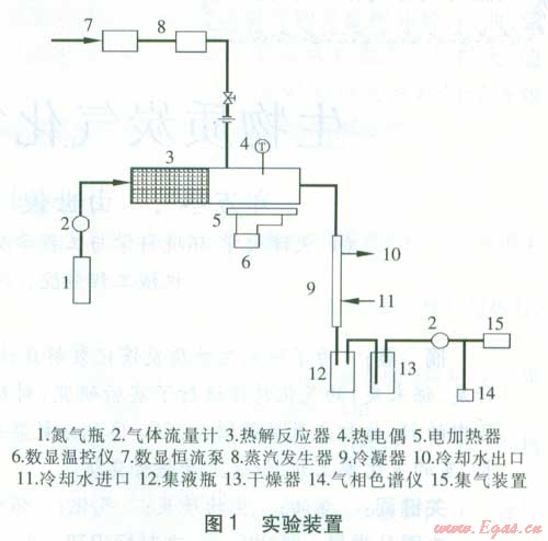 實(shí)驗(yàn)裝置見圖l,該系統(tǒng)包括熱解反應(yīng)器、蒸汽發(fā)生器、熱解氣冷卻裝置、檢測系統(tǒng)等。熱解反應(yīng)器為長450 mm、內(nèi)直徑為70 mm的不銹鋼圓柱體。熱解反應(yīng)器左端長200 mm的區(qū)域?yàn)椴牧洗娣艆^(qū),右端長200 mm的區(qū)域?yàn)樯镔|(zhì)熱解區(qū),50 mm長的中間問隔是為了減輕材料的預(yù)熱解。生物質(zhì)熱解區(qū)由獨(dú)立的電加熱器加熱,加熱功率為1.5 kW,溫度由K型熱電偶測量,并由數(shù)顯溫控儀進(jìn)行控制。熱解反應(yīng)器后接1個(gè)長度為300 mm的冷凝器,用以分離可凝結(jié)相和氣體。實(shí)驗(yàn)裝置設(shè)置保溫層,氣體管道采用電加熱的方式保溫,溫度設(shè)定為300℃,主要是為了防止可凝結(jié)相凝結(jié)。水由數(shù)顯恒流泵送入蒸汽發(fā)生器,蒸汽由生物質(zhì)熱解區(qū)最左端加入,其溫度由一個(gè)E型熱電偶測量,并由溫控器控制。