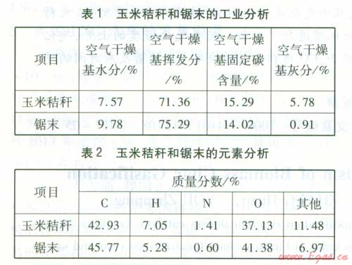 實(shí)驗(yàn)所選材料分別為玉米秸稈和鋸末。玉米秸稈和鋸末均為常見的生物質(zhì)原料,其低熱值分別為15.84、20.10 MJ/kgl 71,工業(yè)分析和元素分析分別見表1、2。