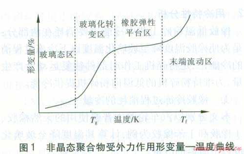 通常所說(shuō)的橡膠是指玻璃化溫度(Tg)低于室溫的非晶態(tài)聚合物。橡膠和塑料就是按照玻璃化溫度是在室溫以上還是在室溫以下進(jìn)行區(qū)分的。玻璃化溫度在室溫以下的聚合物稱(chēng)為橡膠,玻璃化溫度在室溫以上的聚合物稱(chēng)為塑料。玻璃化溫度是聚合物的特征溫度之一,非晶態(tài)聚合物在玻璃化溫度附近發(fā)生玻璃態(tài)一橡膠態(tài)轉(zhuǎn)變。圖l為非晶態(tài)聚合物受外力作用產(chǎn)生的形變量一溫度變化曲線(xiàn)。對(duì)于同一種聚合物,當(dāng)其溫度大于Tg時(shí),聚合物處于橡膠態(tài);當(dāng)溫度小于Tg時(shí),聚合物處于玻璃態(tài)。處于橡膠態(tài)的聚合物當(dāng)有外力作用時(shí)發(fā)生大的形變,外力撤去后形變可以恢復(fù),也就是我們通常所說(shuō)的橡膠彈性。在一定溫度范圍內(nèi)(橡膠彈性平臺(tái)區(qū)),當(dāng)溫度降低時(shí),處于橡膠態(tài)的聚合物在外力作用下的形變量隨溫度變化很小。隨著溫度的下降,在玻璃化溫度附近,當(dāng)溫度發(fā)生很小變化時(shí),聚合物受外力產(chǎn)生的形變量隨溫度變化出現(xiàn)明顯變化,表現(xiàn)為隨溫度的降低形變量顯著減小。當(dāng)溫度繼續(xù)降低,聚合物進(jìn)入玻璃態(tài),此時(shí)聚合物已完成了橡膠態(tài)一玻璃態(tài)之間的轉(zhuǎn)變,在外力作用下聚合物的形變量受溫度變化影響很小,形變量也很小。廢舊橡膠低溫粉碎就是通過(guò)冷凍使橡膠溫度降至玻璃化溫度以下,使其進(jìn)入玻璃態(tài),低溫下橡膠分子鏈段不能運(yùn)動(dòng),表現(xiàn)出膪|生,從而易于粉碎。