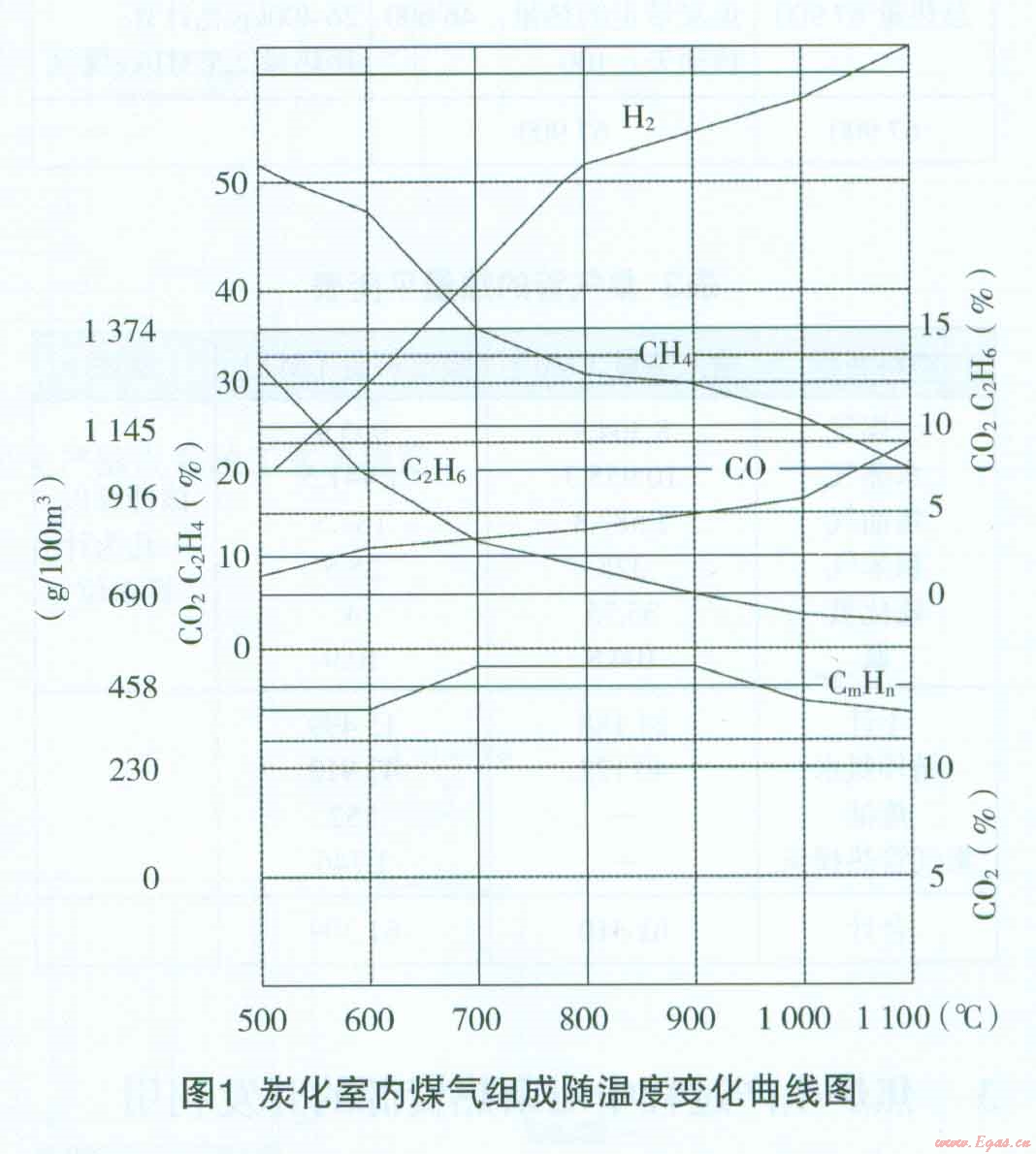 由圖l可以看出,煤氣中甲烷及其同系物,二氧化碳的含量是隨著溫度的升高而降低,而氫及一氧化碳含量是隨著溫度升高而增加的,烴含量在800℃一900℃時達(dá)到最大值。