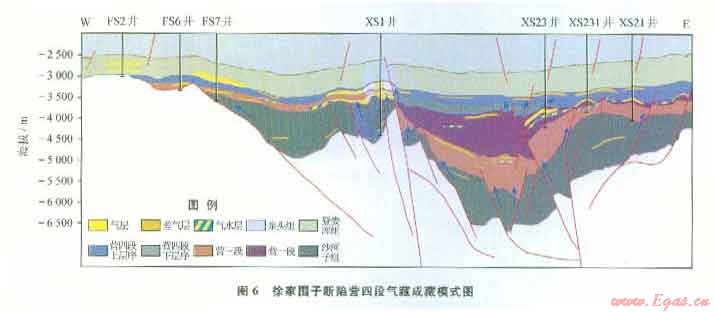摘 要 松遼盆地徐家圍子斷陷下白堊統(tǒng)營城組四段致密砂礫巖儲(chǔ)層是該區(qū)深層天然氣勘探的儲(chǔ)量接替層系之一,為預(yù)測(cè)其有利勘探區(qū)帶,應(yīng)用高精度層序地層學(xué)方法,研究了營四段層序地層與致密氣藏形成的關(guān)系。①根據(jù)地層發(fā)育特征、地層旋回性和巖相發(fā)育特征,將營四段劃分為2個(gè)三級(jí)層序,每一層序界面都有明顯的地震響應(yīng)、測(cè)井響應(yīng)和沉積學(xué)標(biāo)志特征。②建立了營四段層序地層格架,營四段下層序(Sql)分布僅局限在斷陷中心部位,發(fā)育半深湖一扇三角洲前緣亞相,以暗色泥巖為主,其為優(yōu)質(zhì)的烴源巖,可為上覆營四段提供氣源;營四段上層序(Sq2)的辮狀河三角洲前緣亞相物性好,是主要儲(chǔ)層發(fā)育的有利部位。③構(gòu)建了營四段致密砂礫巖氣藏的2種成藏模式:一種是沙河子組為烴源巖,斷裂為運(yùn)移通道,砂礫巖與火山巖為儲(chǔ)層的下生上儲(chǔ)式成藏模式,有利勘探區(qū)位于興城、徐東和徐南地區(qū),預(yù)測(cè)天然氣資源潛力達(dá)450×108 m3;另一種是營四段下層序暗色泥巖為烴源巖,上層序砂礫巖為儲(chǔ)層,自生自儲(chǔ)或下生上儲(chǔ)式成藏模式,有利區(qū)位于斷陷中心的XS22井區(qū),預(yù)測(cè)天然氣資源潛力約為l00×108 m3。
