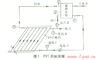 PVT系統(tǒng)實(shí)驗(yàn)流程見圖l,設(shè)置溫度計(jì)、流量計(jì)、電流表、電壓表,測量各測點(diǎn)的溫度、水的流量及計(jì)算PVT模塊的發(fā)電功率。實(shí)驗(yàn)臺布置見圖4。