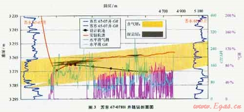 由于蘇里格氣田復(fù)雜的砂體疊置關(guān)系,常見以交錯單砂體所引起的“假構(gòu)造”,因此,水平段地質(zhì)導(dǎo)向關(guān)鍵是對水平井部署區(qū)域目標(biāo)層“真假構(gòu)造”的識別。但無論是同一砂體真構(gòu)造,還是由不同砂體形成的假構(gòu)造,水平段施工都不應(yīng)過分注重設(shè)計(jì)構(gòu)造趨勢而忽視巖性變化,應(yīng)以“先追蹤砂體、后參考構(gòu)造”的原則靈活調(diào)整導(dǎo)向。以蘇里格氣田中區(qū)水平井施工為例,采取該導(dǎo)向方法取得了顯著效果,全年有5口井采取追蹤砂體導(dǎo)向而偏離設(shè)計(jì)井眼軌跡獲得成功,砂層鉆遇率明顯提高。典型井如蘇東67-07H1井,水平段末端與設(shè)計(jì)井眼軌跡偏差達(dá)11m,而砂層鉆遇率達(dá)到84.4%(圖3)。