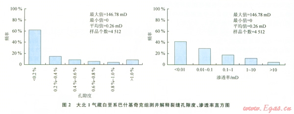 裂縫滲透率主要分布在010 mD,最大值l46.78mD,平均值為0.26 mD(2),裂縫的發(fā)育對改善儲層物性,尤其是滲透率有非常重要的作用。