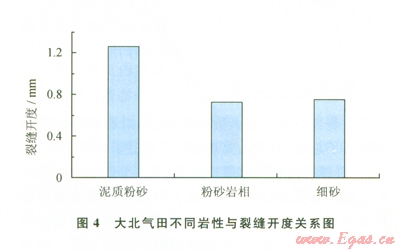 大北單井平均裂縫開度統(tǒng)計結(jié)果表明,在泥質(zhì)粉砂巖中裂縫開度最大,平均開度大于l.2 mm;粉砂巖、細(xì)砂巖裂縫平均開度相差不大,平均裂縫開度都介于0.80.9 mm之間(4),裂縫的存在大大改善了泥質(zhì)粉砂巖的孔隙度和滲透率,提高了單井產(chǎn)能。