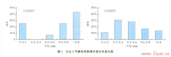 根據(jù)巖心觀察和校正后,大北氣田儲層段宏觀裂縫開度大于0.2 mm占多數(shù)(1),其中大北101井開度大于0.2 mm75%;小于0.2 mm的占25%。大北102井開度大于0.2 mm占統(tǒng)總數(shù)的89%,說明儲層宏觀裂縫開度發(fā)育,對氣藏開發(fā)具有建造性作用。