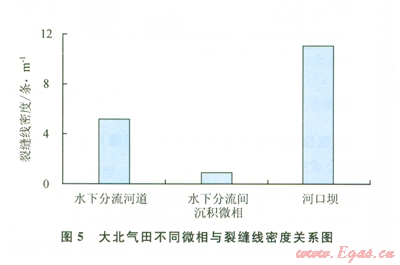 而根據(jù)單井統(tǒng)計的裂縫線密度與沉積微相的關(guān)系圖表明:河口壩平均裂縫線密度為11條/m,平均裂縫線密度最大,裂縫最發(fā)育;水下分流河道微相平均裂縫線密度為5條/m;分流間灣裂縫最不發(fā)育,平均線密度只有不到1條/m(5)