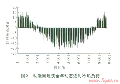 采用Energyplus模擬計算動漫園建筑全年動態(tài)逐時冷熱電負(fù)荷。全年動態(tài)逐時冷熱負(fù)荷見圖3,圖中正值為熱負(fù)荷,負(fù)值為冷負(fù)荷。由圖3可知,全年最大冷負(fù)荷為20 532.8 kW,最大熱負(fù)荷為15 987.3kW。建筑全年各時段用電負(fù)荷(不含空調(diào)系統(tǒng)用電負(fù)荷)比較均衡,全年最大用電負(fù)荷為6 883.5 kW。