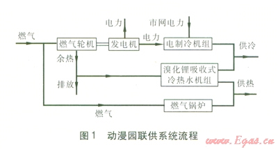 動漫園聯(lián)供系統(tǒng)流程見圖1。聯(lián)供系統(tǒng)由燃?xì)廨啓C(jī)發(fā)電機(jī)組(以下簡稱發(fā)電機(jī)組)、溴化鋰吸收式冷熱水機(jī)組(以下簡稱吸收式機(jī)組)、電制冷機(jī)組(離心式冷水機(jī)組)和燃?xì)忮仩t組成。發(fā)電機(jī)組發(fā)電和市政電網(wǎng)電用于滿足建筑的電負(fù)荷。電制冷機(jī)組所需電量優(yōu)先采用發(fā)電機(jī)組發(fā)電,不足部分由市政電網(wǎng)補(bǔ)充。發(fā)電機(jī)組發(fā)電量作為自用,不上網(wǎng)銷售,發(fā)電余熱驅(qū)動吸收式機(jī)組向建筑供熱或供冷。當(dāng)供熱量不足時由燃?xì)忮仩t補(bǔ)充,制冷量不足時由電制冷機(jī)組補(bǔ)充。