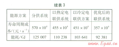 以熱定電聯(lián)供方案按照吸收式機(jī)組供熱量與熱負(fù)荷之比確定。經(jīng)模型優(yōu)化后,當(dāng)聯(lián)供系統(tǒng)壽命周期成本最小時,吸收式機(jī)組供熱量與熱負(fù)荷之比為0.4,即以熱定電聯(lián)供方案中吸收式機(jī)組的供熱量確定為熱負(fù)荷的40%,再根據(jù)吸收式機(jī)組的制熱性能系數(shù)確定所需熱量,從而確定以熱定電聯(lián)供系統(tǒng)的配置方案。以冷定電聯(lián)供方案的確定與以熱定電聯(lián)供系統(tǒng)方法基本一致,區(qū)別在于,經(jīng)模型優(yōu)化后,當(dāng)聯(lián)供系統(tǒng)壽命周期成本最小時,吸收式機(jī)組的供冷量與冷負(fù)荷之比為0.3。由表3可知,優(yōu)化后的聯(lián)供系統(tǒng)壽命周期成本及能耗最低,這表明優(yōu)化后的聯(lián)供系統(tǒng)在經(jīng)濟(jì)性及節(jié)能方面均具有一定優(yōu)勢。