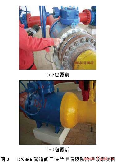 泄漏,然后按照上述施工流程對法蘭進行碳纖維復(fù)合材料堵漏加固處理,待復(fù)合材料養(yǎng)護固化后,進行耐壓密封試驗。結(jié)果表明:采用碳纖維復(fù)合材料進行管道法蘭滲漏治理,管道系統(tǒng)連接法蘭在 10 MPa 介質(zhì)壓力下,露天環(huán)境下穩(wěn)壓 14 d,堵漏區(qū)域無任何泄漏。可見,該套技術(shù)方案對存在泄漏隱患的管道法蘭泄漏治理非常有效。由于該套技術(shù)方案具有作業(yè)不動火、操作安全、成本費用低等特點,2008-2011年,采用復(fù)合材料修復(fù)技術(shù)對西氣東輸全線 220 多個線路閥室旁通管道 DN356 閥門連接法蘭及各站場與干線連接的DN50 和 DN80 管道法蘭泄漏隱患進行治理(圖 3),在確保管道安全平穩(wěn)運行的同時,節(jié)約了大量維修費用。復(fù)合材料修復(fù)對法蘭結(jié)構(gòu)具有一定的加固作用,可提高法蘭的抗軸向拉伸、彎曲能力,防止密封面泄漏情況進一步惡化。但是,對于已經(jīng)出現(xiàn)明顯泄漏的高壓(7 MPa 以上)法蘭,治理效果不佳。