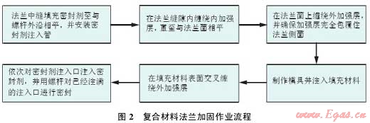 基本原理:對連接法蘭面間隙填充高強度堵漏密封材料,再用由高強度纖維與環(huán)氧粘結(jié)劑組成的復(fù)合材料對法蘭連接部位進行整體外包覆,待復(fù)合材料結(jié)構(gòu)固化后,形成一個高強度殼體結(jié)構(gòu),實現(xiàn)整體加固,達到預(yù)防法蘭泄漏的目的(圖 2)。
