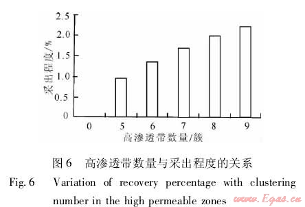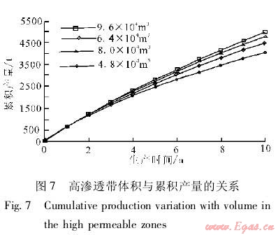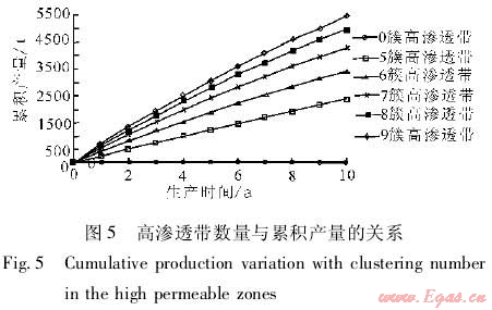 在建立的數(shù)值模型中嵌入高滲透帶,改變高滲透帶的特征參數(shù),通過數(shù)值模擬分析高滲透帶對累積產量和采出程度的影響。