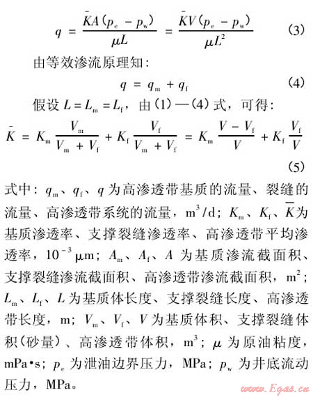 式(5)建立了單簇高滲透帶系統(tǒng)滲透率、基質滲透率、支撐裂縫滲透率與高滲透帶體積、支撐裂縫體積(砂量)之間的關系。